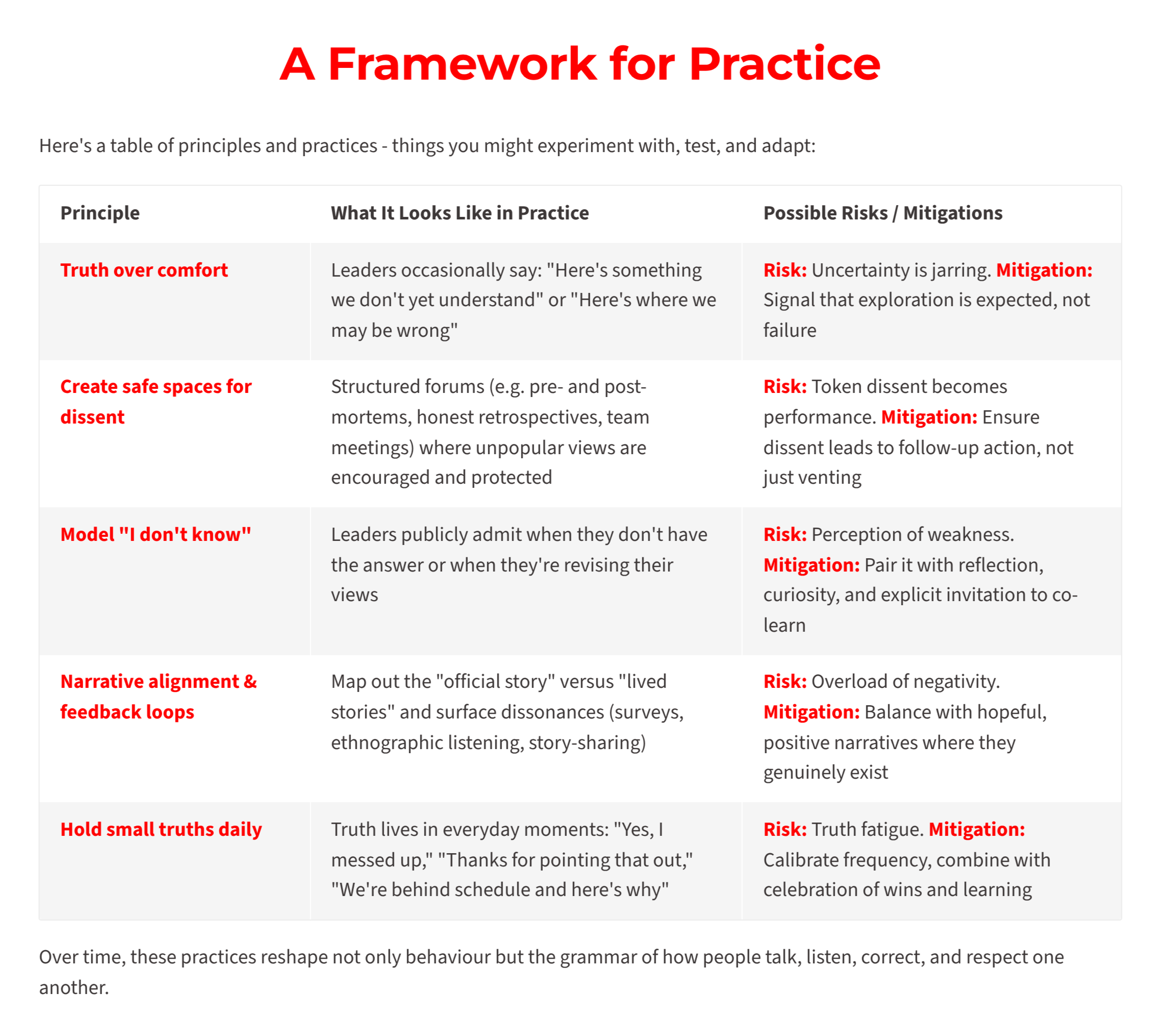 In complex environments, we don't have perfect foresight. If we mask reality to preserve appearances, we blind ourselves to feedback. When we face truth, even messy, hard to hear truth - we can course-correct, learn, and adapt. Organisations that can't tell themselves the truth can't respond to change.